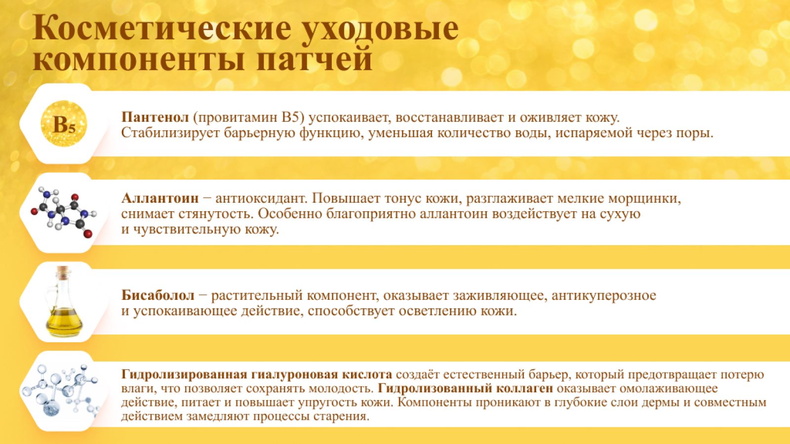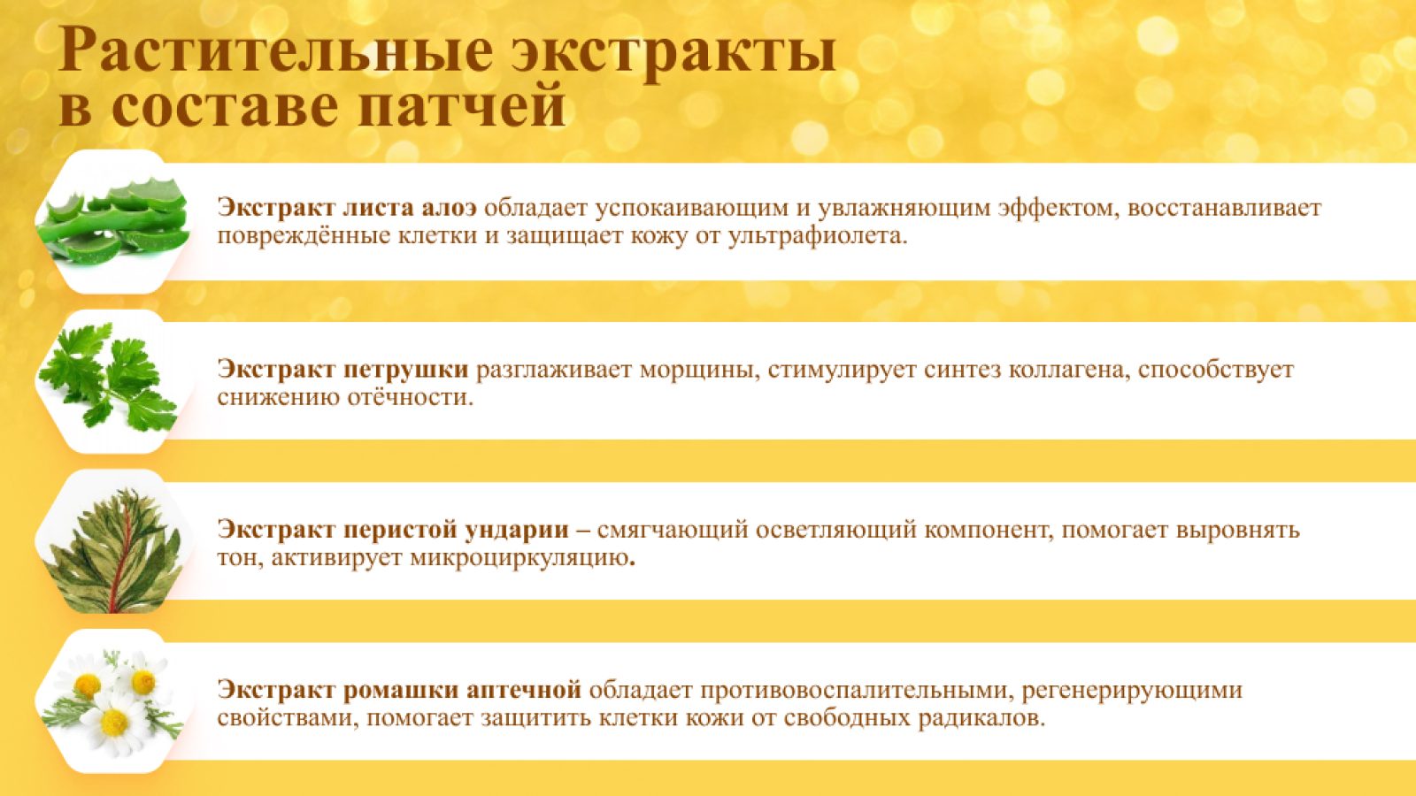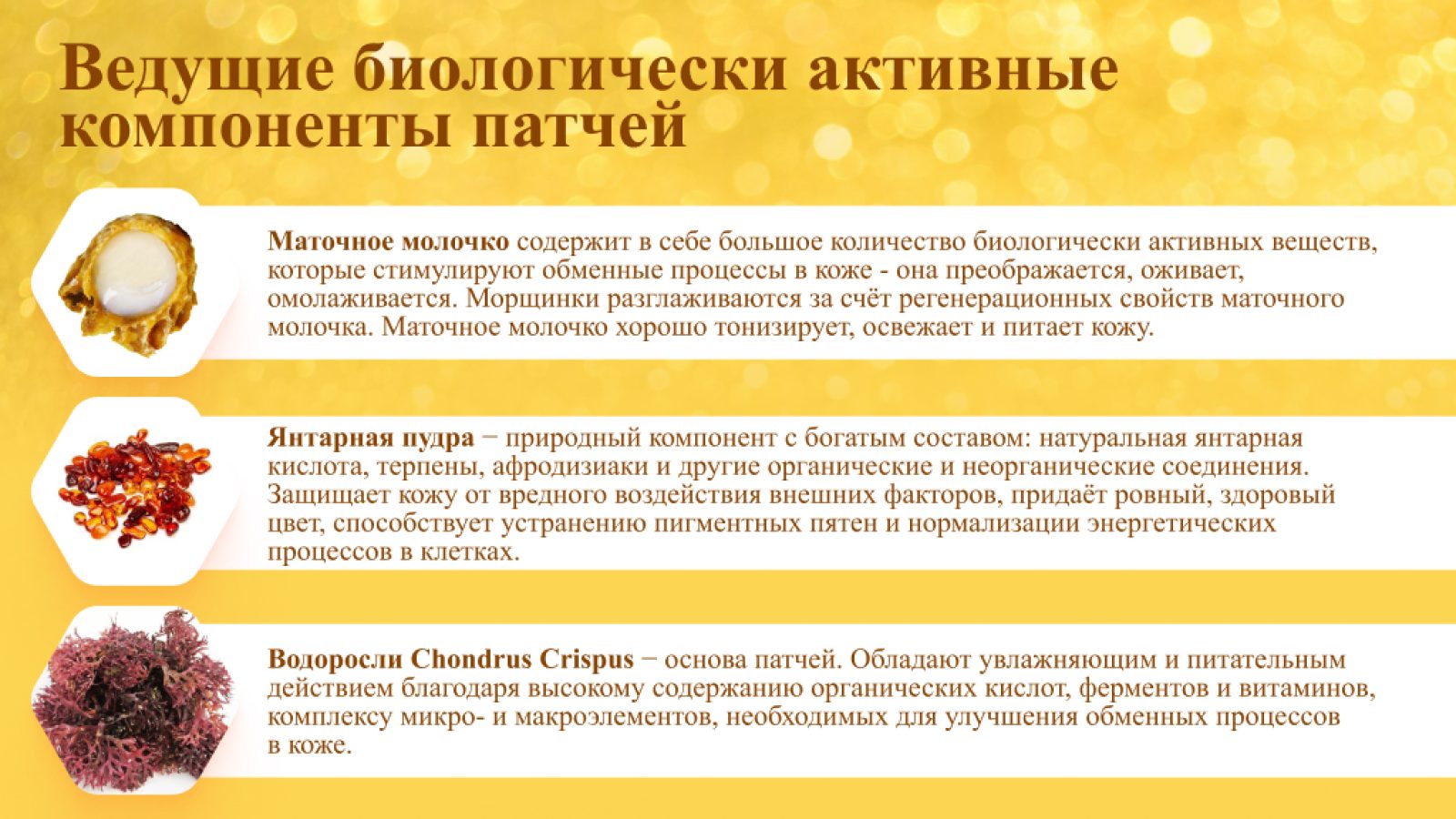 У нашей продукции три огромных плюса. Во-первых, натуральная гидрогелевая основа из водорослей Chondrus Crispus. Если в тканевых и силиконовых патчах «работает» только сыворотка, которой они пропитаны, то у нас даже основа выступает активным компонентом. Водоросль ирландский мох обладает увлажняющими и питательными свойствами, улучшает проникновение остальных активных компонентов.